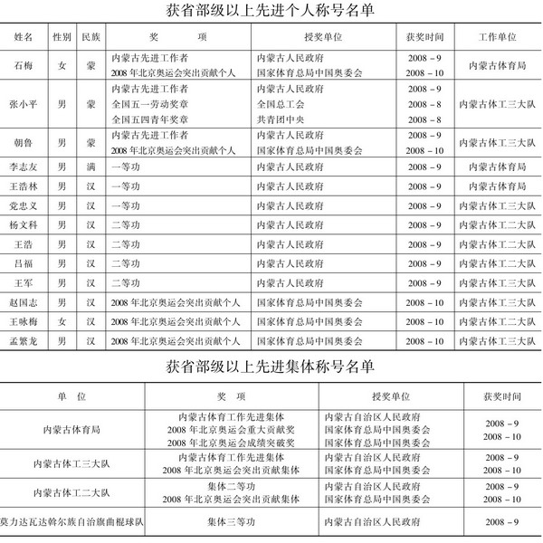 【競技體育】年內(nèi),各盟市在自治區(qū)體育局注冊(cè)的青少年運(yùn)動(dòng)員7 500多名,在國家體育總局注冊(cè)的運(yùn)動(dòng)員1 200多名,是歷史上人數(shù)最多的一年。各項(xiàng)青少年錦標(biāo)賽參賽人數(shù)大幅度增加,柔道600多人、拳擊400多人、摔跤600多人,射箭由以往每年僅有三四十人參加增加到2008年達(dá)到200多人,田徑比賽人數(shù)突破1 200人,是歷史上的最好水平。2008年有自治區(qū)級(jí)競技體育后備人才基地31個(gè);有各級(jí)各類體校77所,其中省級(jí)1所,市級(jí)12所,旗、縣、區(qū)級(jí)64所,教練員人數(shù)666人,在訓(xùn)人數(shù)達(dá)11 000多人。2008年,自治區(qū)優(yōu)秀運(yùn)動(dòng)員參加包括北京奧運(yùn)會(huì)在內(nèi)的70多項(xiàng)國際、國內(nèi)賽事,共獲得30個(gè)第一名、28個(gè)第二名、47個(gè)第三名,113人次進(jìn)入比賽名次,其中,剛成立兩年的女子拳擊獲得亞洲錦標(biāo)賽第二名和世界錦標(biāo)賽第三名;女子乒乓球隊(duì)成功晉級(jí)甲A,是自治區(qū)乒乓球隊(duì)參加俱樂部比賽以來取得的最好成績。