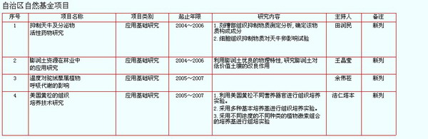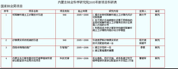 【科研項目】 自治區(qū)林業(yè)科學(xué)研究院承擔(dān)的科研項目共46項,其中延續(xù)項目33項,新列項目13項(詳見2005年科研項目表)。按項目類別統(tǒng)計科技攻關(guān)14項,自然科學(xué)基金9項,引智及引進(jìn)技術(shù)11項,“973”專題1項,科技支撐2項,科技推廣3項,成果轉(zhuǎn)化1項,國際科技合作3項,科技能力建設(shè)1項,科技扶貧1項。在2005年承擔(dān)的13項新項目中,948項目2項,主要有“可降解纖維土工沙障技術(shù)引進(jìn)”、“沙棘果實采收機(jī)械的引進(jìn)”項目;引智推廣項目5項,主要有“四倍體刺槐的推廣”、“亞洲中部水循環(huán)及其對全球變化的影響”、“流動沙丘固定新技術(shù)及材料的應(yīng)用”等;應(yīng)用基礎(chǔ)研究5項,其中應(yīng)用研究項目主要有“內(nèi)蒙古固沙源治理區(qū)生態(tài)變化跟蹤評估體系研究”、“抑制天牛及分泌物活性藥物研究”、“膨潤土資源在林業(yè)中的應(yīng)用研究”等。