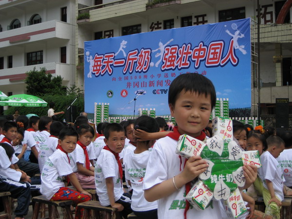井岡山啟動活動:2006年內(nèi)蒙古蒙牛乳業(yè)集團股份有限公司率先向全國貧困地區(qū)500所中小學捐贈牛奶一年,預(yù)計受益小學生在7~10萬人,所捐牛奶總價值達1.1億元.