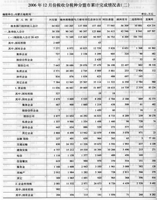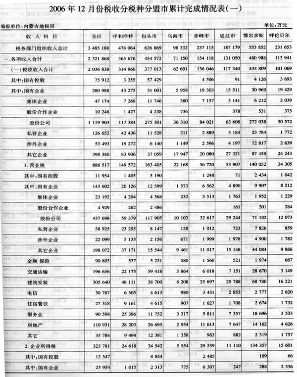 8.分入庫級次看, 自治區(qū)級收入成倍增長。2006年全區(qū)實行新的財政管理體制后,營業(yè)稅、企業(yè)所得稅、個人所得稅、資源稅成為自治區(qū)與盟市共享稅,自治區(qū)級收入成倍增長,盟市以下級收入增幅趨緩。自治區(qū)級收入累計入庫32.93億元,同比增加24.64億元,增長297.22%,黨中央級收入和盟市以下級收入分別入庫34.06億元和165.20億元,同比增加7.29億元和17.95億元,增長27.25%和12.19%。
