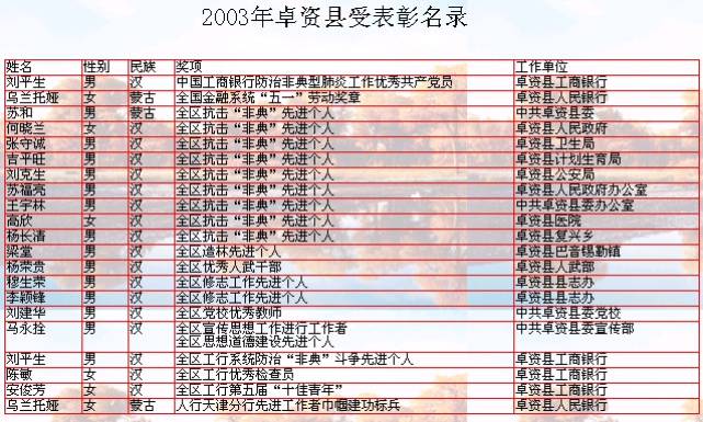 6.6月,卓資縣卓資山鎮(zhèn)個(gè)體醫(yī)生趙存虎為防治“非典”獻(xiàn)計(jì)獻(xiàn)策,提出“中西醫(yī)結(jié)合SARS治療方案”并加注“病因、病機(jī)分析”與“方義解釋”,經(jīng)國(guó)家中醫(yī)藥管理局組織專家論證通過(guò),在“中西醫(yī)在線網(wǎng)站”登載。國(guó)家中醫(yī)藥管理局給趙存虎的復(fù)函中對(duì)趙存虎的愛(ài)國(guó)熱情和奉獻(xiàn)精神給予了很高的評(píng)價(jià)。