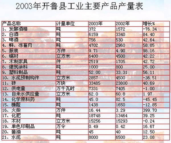 【概況】開魯縣位于內(nèi)蒙古中東部,隸屬通遼市。總區(qū)域面積4 488平方公里,總?cè)丝?9萬,共有漢、蒙、滿、回等11個民族,轄18個蘇木鄉(xiāng)鎮(zhèn)及保安農(nóng)場、遼河農(nóng)場。國民經(jīng)濟(jì)快速增長。2003年,國內(nèi)生產(chǎn)總值實現(xiàn)31.0億元,按可比價格計算,比上年增長18.6%,加快2.5個百分點。其中第一產(chǎn)業(yè)增加值實現(xiàn)15.5億元,比上年增長13.0%,加快1.2個百分點;第二產(chǎn)業(yè)增加值實現(xiàn)6.9億元,比上年增長28.2%,加快7.2個百分點;第三產(chǎn)業(yè)增加值實現(xiàn)8.6億元,比上年增長22.3%,加快1.1個百分點。全縣財政收入完成8 200萬元,比上年增長13.89%,其中地方財政收入完成6 528萬元,比上年增長18.28%。居民消費(fèi)價格總指數(shù)上漲1.8%;商品零售價格指數(shù)上漲1.2%;農(nóng)業(yè)生產(chǎn)資料價格指數(shù)下降2.0%。年末全縣從業(yè)人員19.64萬人,比上年增加0.42萬人,增長2.16%;全年有1 622名下崗失業(yè)人員實現(xiàn)再就業(yè)。年末,城鎮(zhèn)登記失業(yè)率為3.9%。