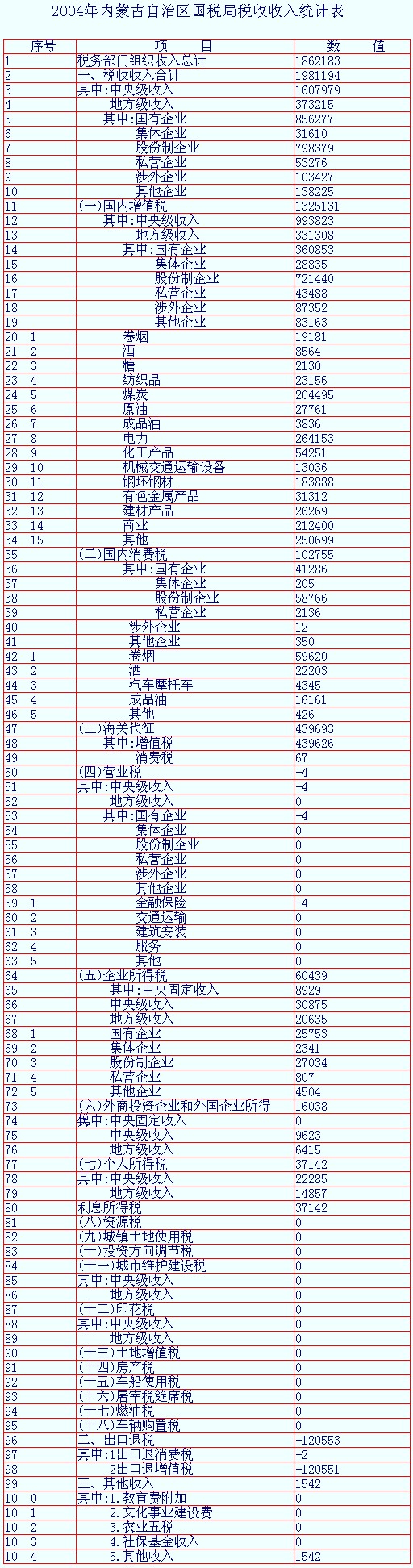 【稅收收入】2004年全區(qū)國稅系統(tǒng)完成稅收收入153.9億元,比上年增收46.6億元,同比增長43.1%,提前并超額完成全年收入任務。其中:國內增值稅累計完成132.3億元,同比增收40.8億元,增長44.5%,增幅列全國第一位;國內消費稅完成10.3億元,同比增收1.7億元,增長19.7%。