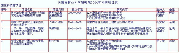 【科研項目】是年,林科院承擔科研項目39項,其中科技跨越項目1項、科技攻關項目15項、自然科學基金項目5項、引智及引進技術項目7項、“973”專題1項、科技支撐項目2項、科技成果推廣項目3項、科技成果轉化項目1項、國際合作項目3項、科技扶貧項目1項(見內蒙古林業(yè)科學研究院2004年科研項目表)。