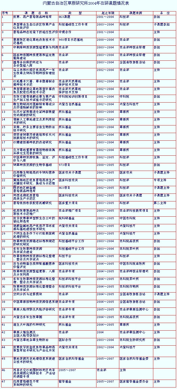 【科研項(xiàng)目】是年,新獲準(zhǔn)立項(xiàng)項(xiàng)目15項(xiàng)。2004年底草原所在研科研項(xiàng)目達(dá)到47項(xiàng)(詳見(jiàn)內(nèi)蒙古自治區(qū)草原研究所2004年在研課題情況表);獲得新型實(shí)用專利1項(xiàng);出版科技著作3部;發(fā)表科技論文53篇。