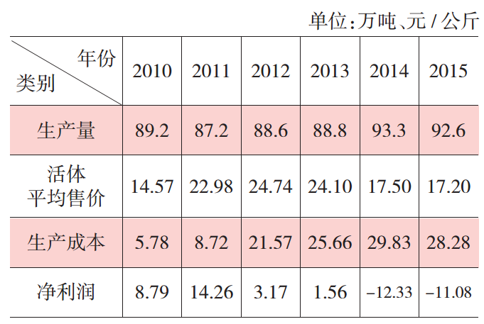 2010—2015年羊肉成本收益情況分析表