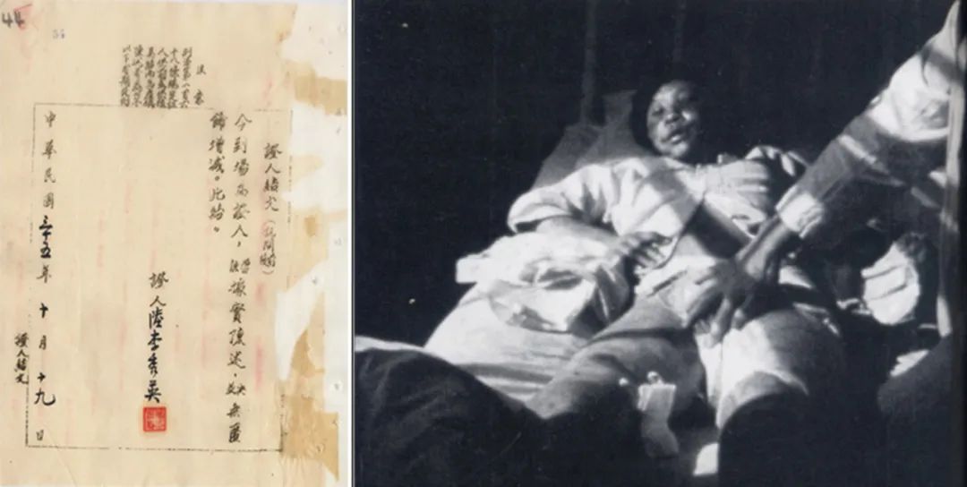 左圖為南京大屠殺幸存者李秀英的證人結(jié)文;右圖為1937年12月李秀英在鼓樓醫(yī)院被救治時(shí)的場(chǎng)景。新華社發(fā)