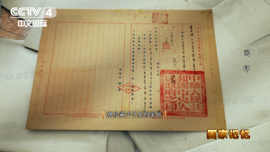 在中央檔案館里珍藏著一份目前所見(jiàn)最早鈐有國(guó)印的文件——“中央人民政府令:茲頒發(fā)人民革命軍事委員會(huì)銅質(zhì)印信壹顆”。