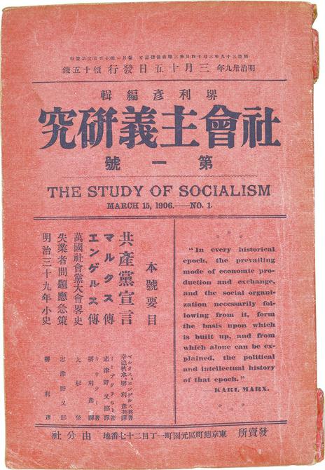 中國(guó)共產(chǎn)黨歷史展覽館展出了日本《社會(huì)主義研究》創(chuàng)刊號(hào),其封面為紅色,印有1888年《共產(chǎn)黨宣言》英文版序言?xún)?nèi)的著名論斷:“每一歷史時(shí)代主要的經(jīng)濟(jì)生產(chǎn)方式和交換方式以及必然由此產(chǎn)生的社會(huì)結(jié)構(gòu),是該時(shí)代政治的和精神的歷史所賴(lài)以確立的基礎(chǔ),并且只有從這一基礎(chǔ)出發(fā),這一歷史才能得到說(shuō)明”;登載的主要篇目有《共產(chǎn)黨宣言》《馬克思傳》《恩格斯傳》;出版時(shí)間為1906年3月15日。研究表明,這是陳望道翻譯《共產(chǎn)黨宣言》所依據(jù)的主要底本。