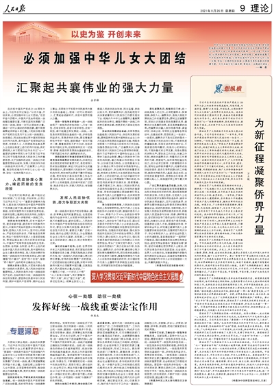 中華兒女大團結(jié)是國家發(fā)展進步的巨大優(yōu)勢,是實現(xiàn)民族復(fù)興的強大力量。習(xí)近平總書記在慶祝中國共產(chǎn)黨成立100周年大會上的重要講話中強調(diào):“以史為鑒、開創(chuàng)未來,必須加強中華兒女大團結(jié)。”新的征程上,繼續(xù)創(chuàng)造屬于中華民族的共同輝煌,必須形成海內(nèi)外全體中華兒女心往一處想、勁往一處使的生動局面,匯聚起實現(xiàn)民族復(fù)興的磅礴力量。今天本版刊發(fā)3篇文章,圍繞這一主題進行闡述。