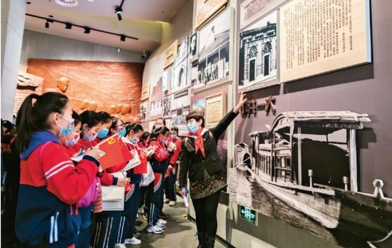 2021年3月25日,內(nèi)蒙古呼和浩特市玉泉區(qū)南茶坊小學(xué)學(xué)生在老師帶領(lǐng)下走進(jìn)內(nèi)蒙古博物院“內(nèi)蒙古革命史陳列”展廳,感受革命情懷,接受“紅色文化”教育。 人民視覺 丁根厚/攝