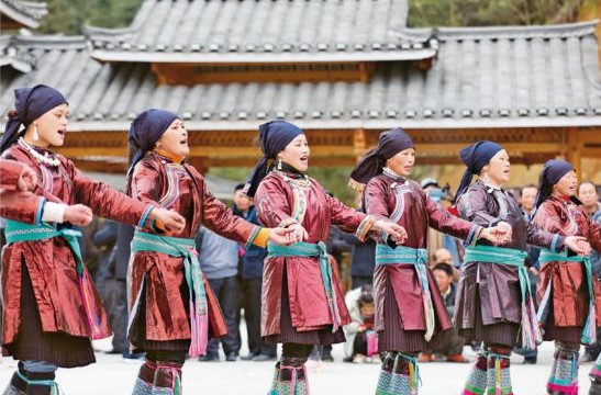 2021年3月21日,廣西柳州三江侗族自治縣八江鎮(zhèn)布代村舉辦傳統(tǒng)春社節(jié),當(dāng)?shù)厝罕娚碇褡迨⒀b,縱情傳唱百年黨史,激情歡歌家鄉(xiāng)巨變,動(dòng)情喜頌黨的恩情。 人民視覺 龔普康/攝