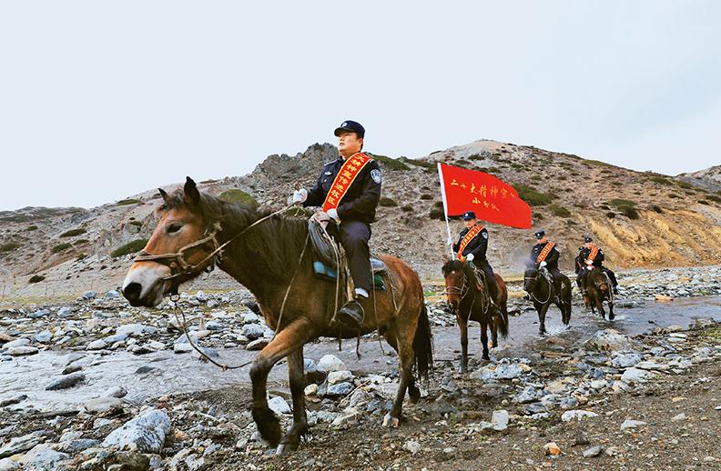 在新疆維吾爾自治區阿勒泰地區,哈巴河邊境管理大隊成立“二十大精神宣傳小分隊”。圖為2022年10月27日,小分隊民警騎馬深入轄區與牧民共同學習黨的二十大精神。 人民視覺 王友波/攝