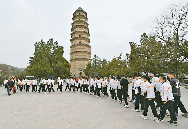 2022年10月,習(xí)近平總書記在瞻仰延安革命紀(jì)念地時(shí)指出,延安革命舊址見證了我們黨在延安時(shí)期領(lǐng)導(dǎo)中國革命、探索馬克思主義中國化時(shí)代化的光輝歷程,是一本永遠(yuǎn)讀不完的書。圖為參觀者在陜西延安寶塔山參觀。 新華社記者 張博文/攝