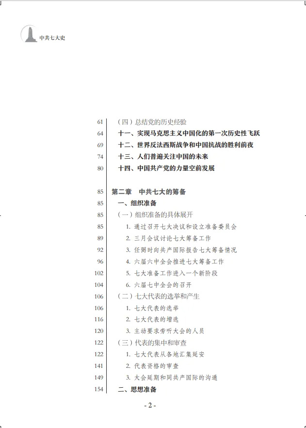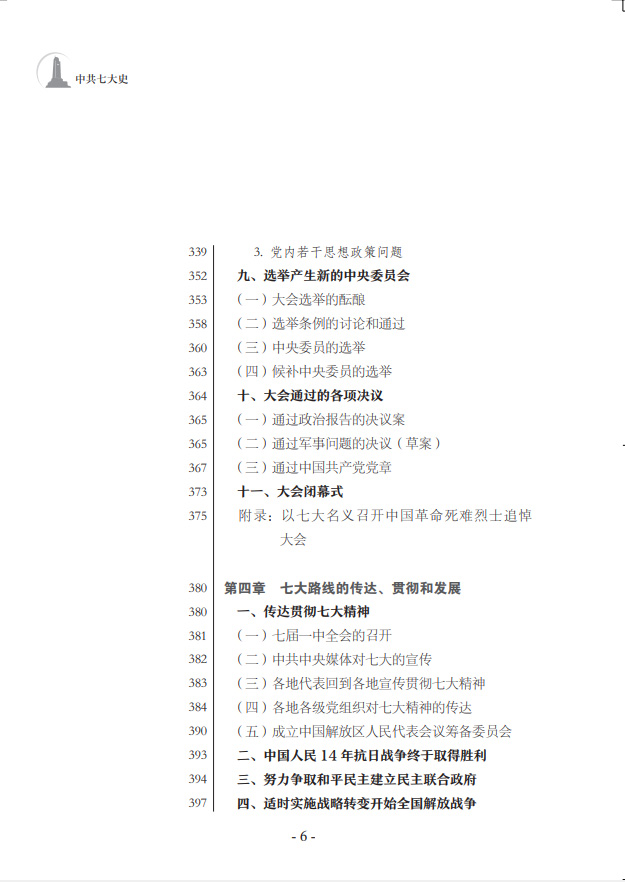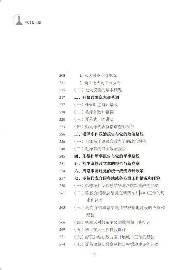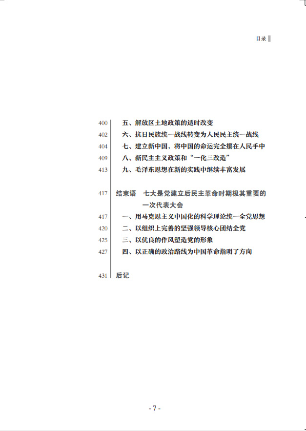中共七大為新中國(guó)的誕生奠定了基礎(chǔ)。鄧小平稱贊中共七大是“建黨以后民主革命時(shí)期我們黨最重要的一次代表大會(huì)”?!吨泄财叽笫贰凡捎米钚鹿嫉臋n案,廣泛收集文獻(xiàn)資料,全面、完整地反映了中共七大籌備召開的全貌,著重說明中共七大的歷史貢獻(xiàn),特別是第一次將毛澤東思想確立為黨的指導(dǎo)思想并寫進(jìn)黨章所產(chǎn)生的重大影響,簡(jiǎn)要介紹了對(duì)中共七大路線、方針、政策的積極貫徹執(zhí)行情況。