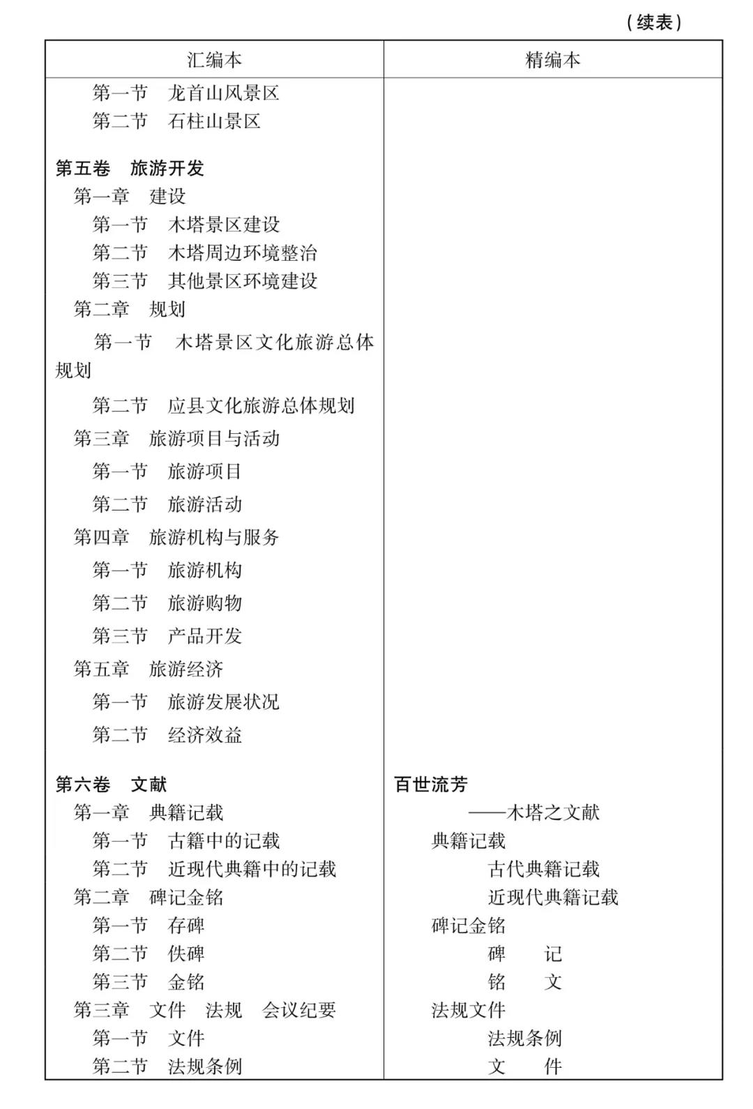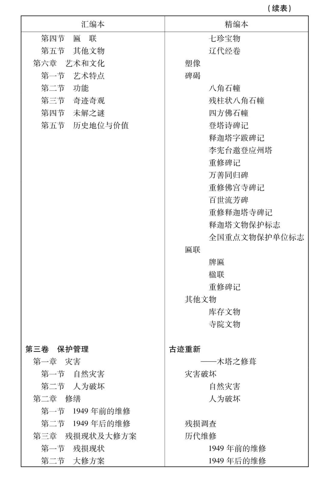 在地方志七大基本體裁——述、記、志、傳、圖、表、錄中,附錄可能是最被忽略或者說被運用得最不好的一種體裁。不少志書附錄選錄標準隨意,內(nèi)容存史價值不高,未能使附錄發(fā)揮出補充正文記述之不足的作用,形同虛設(shè),成了點綴。原稿本附錄輯錄頗富,有關(guān)法規(guī)文件、各種會議紀要等大致皆備。精編本之未設(shè)附錄,主要基于兩種考慮,一是尊重讀者的閱讀習慣——恐怕沒幾個人愿意花時間去看篇幅甚大而閱讀吸引力不足的原始材料;二是一些篇目有較高存史價值,可以補正文有關(guān)部分之不足,卻因敘事體例之限不好展開,或內(nèi)容敏感可能引起較大爭議,或內(nèi)容真實性不好評判,所以未納入正文記述。如杜福先生《塔開多寶現(xiàn)神通——木塔遼代秘藏發(fā)現(xiàn)五十年的回顧》回顧了木塔遼代秘藏文物的發(fā)現(xiàn)、鑒別、修復(fù)、保管等曲折經(jīng)過;唐學仕先生《應(yīng)縣佛宮寺釋迦塔佛牙舍利》一文介紹了佛牙舍利的發(fā)現(xiàn)過程、流傳衍變、鑒定認證等情況,兩文應(yīng)該是當時情況實錄,史料價值頗高,入正文則展不開,入附錄則例不合,故權(quán)作講故事般列入《歲月留痕》篇,是非非,真真假假,皆由讀者自悟。當然,大量的、與正文緊密相關(guān)的內(nèi)容,則已盡量摘取入正文,如會議紀要中涉及的人、事、物等。