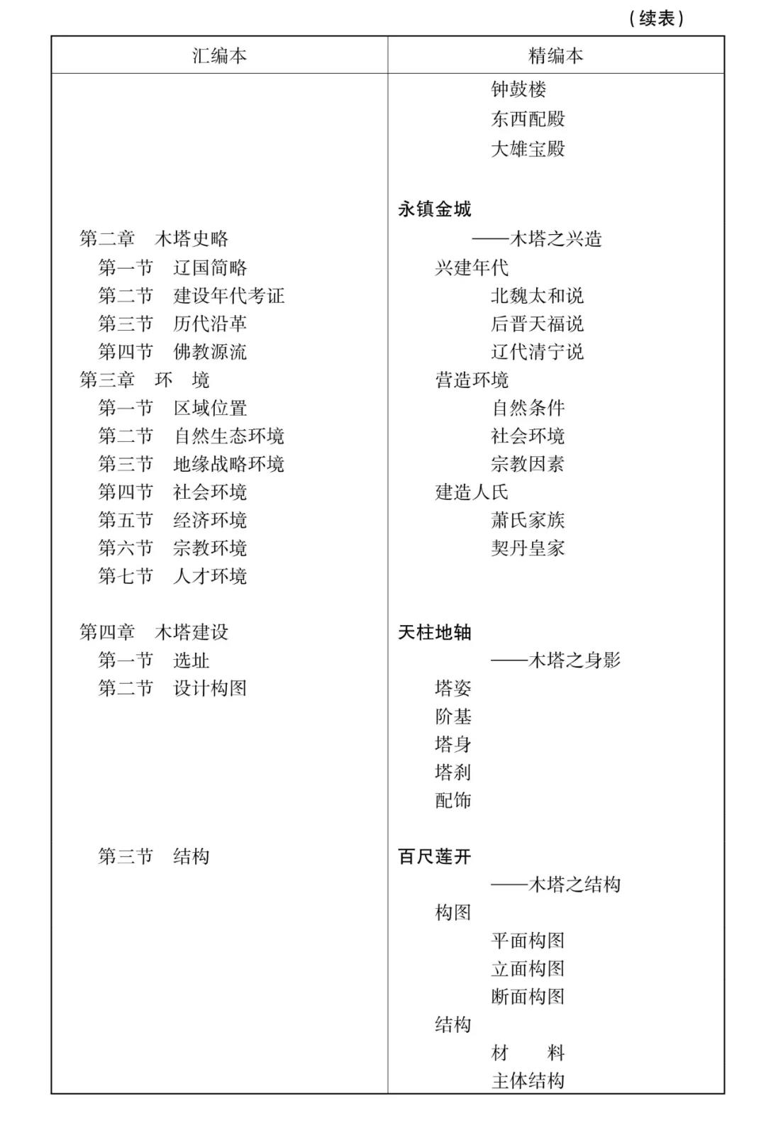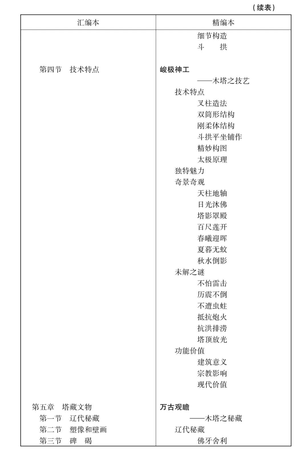 其二,框架安排。書之篇目框架,猶如人體骨骼,錯亂不得。其實,主線清晰了,先講什么后講什么,篇目框架也就明確了。從閱讀習慣上說,讀者首先肯定想知道木塔具體坐落于何方?為什么坐落于這個地方?這個地方自然、社會、人文環(huán)境怎樣?所以正文開篇——《塔鄉(xiāng)應(yīng)縣》篇,即對木塔之故鄉(xiāng)的區(qū)位境域、建置區(qū)劃、自然環(huán)境、經(jīng)濟社會、歷史人文、城邑市鎮(zhèn)、民情土俗等情況進行介紹,同時解讀當年木塔之所以建在應(yīng)地,與其特殊的地理區(qū)位有關(guān)。應(yīng)縣處于雁門關(guān)北面,當年宋遼在這一帶大致就是以雁門關(guān)為分界線。應(yīng)縣地處大同盆地,南北皆山,應(yīng)縣縣城相距雁門關(guān)不遠,其間一馬平川,所以當年在應(yīng)縣建塔,不只是考慮了宗教作用,同時兼具軍事用途——瞭望塔。木塔所處的大環(huán)境是應(yīng)縣,小地境是佛宮寺。佛宮寺因何而建,已不可考。木塔歷千年猶巍然雄峙,佛宮寺則迭遭損毀。寺之聲名雖遠不如塔,但畢竟寺是塔的載體,是其駐足之地,故接下來兩篇——《佛宮名剎》篇介紹了佛宮寺的情況,《永鎮(zhèn)金城》篇則考證分析了木塔興造諸般情況。之后各篇,大致以塔本身有關(guān)的情況(如內(nèi)外概貌、細節(jié)構(gòu)造、建筑技藝、塔藏珍物)、修葺保護、開發(fā)利用、文化藝術(shù)、名人故事等為脈絡(luò),逐步展開,安排框架,各篇形成一個有機整體。原稿本是章節(jié)體,精編本是條目體,下面詳列兩者主體框架,以供閱者對比。