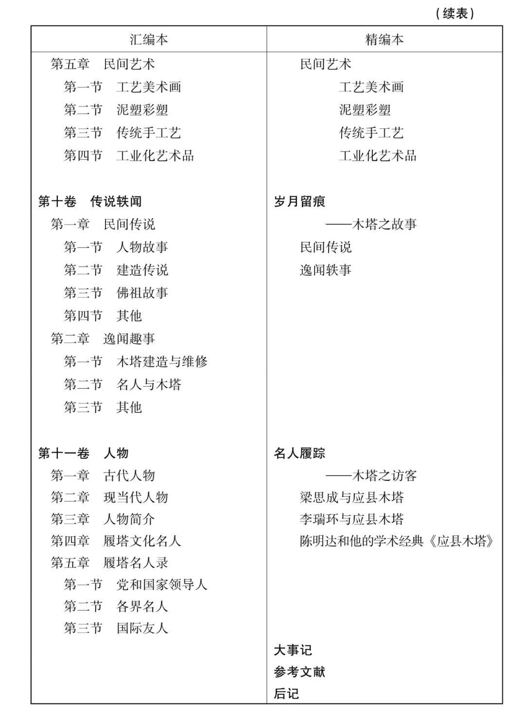 其三,注釋。學術(shù)界質(zhì)疑地方志權(quán)威性較多之點,是大部分資料未注明出處,不便于研究引用。其間有誤解的成分,因為志書凡例肯定注明了資料的主要來源——政府各有關(guān)部門,這是志書通例。志書是資料性文獻,核心功能是存史,應(yīng)盡可能多地保存有價值信息。鑒于地方志絕大部分資料都由有關(guān)部門對口提供,可說絕大部分資料都來源有自,并在《凡例》中說明,若再按嚴謹?shù)膶W術(shù)著作那樣凡引必注,那么一部100萬字的志書可能就成了150萬字乃至更大的部頭,無形中極大地增大了篇幅。盡管如此,我個人還是認為若《凡例》沒有交代出處的資料,如個人研究成果、社會調(diào)查、口述史料等,還是應(yīng)該以適當方式交代其來源——可以在正文記述中帶出來,也可以是專門注釋,這樣可以增強志書的著述性。精編本參考了大量的研究成果,如《佛宮名剎》《永鎮(zhèn)金城》《天柱地軸》諸篇主要依據(jù)王豐主編之《應(yīng)縣釋迦塔論集》《應(yīng)縣釋迦塔傳奇》中的相關(guān)文章及應(yīng)縣歷代志書等記載,綜合整理而成;《天柱地軸》《百尺蓮開》《峻極神工》諸篇主要參考梁思成《梁思成全集》(第10卷)、陳明達《應(yīng)縣木塔》、李世溫《應(yīng)縣木塔》諸書;《萬古觀瞻》篇主要參考杜?!稇?yīng)縣木塔揭秘》《應(yīng)縣木塔匾聯(lián)》等書及一些研究文章;《古跡重新》《萬象逢春》篇主要參考侯衛(wèi)東《應(yīng)縣木塔保護研究》一書及張暢耕、李世溫等人的研究論文。志書未按純學術(shù)著作的注釋方式進行處理,而是在相關(guān)地方大致說明參考了誰的研究成果,表達出對先行者的敬意。這樣處理算是一種折中——介于純學術(shù)著作與通俗讀物之間,在方志界未對如何科學處理志書注釋問題取得一致意見的背景下,也算是一種創(chuàng)新嘗試。