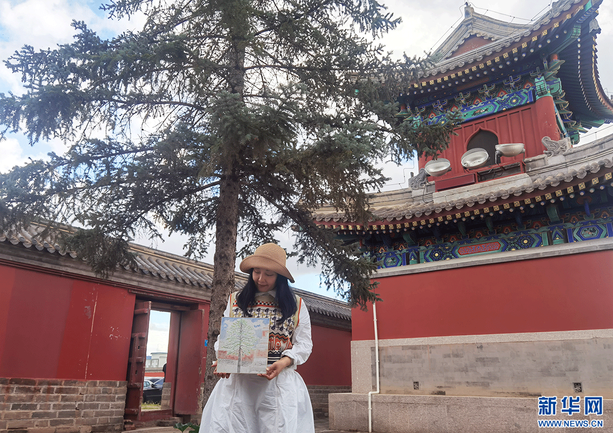7月25日,畫家徐冬青在錫林郭勒盟匯宗寺與作品合影。新華網(wǎng)徐紅梅 攝