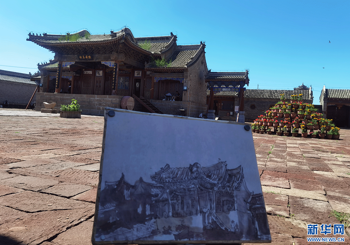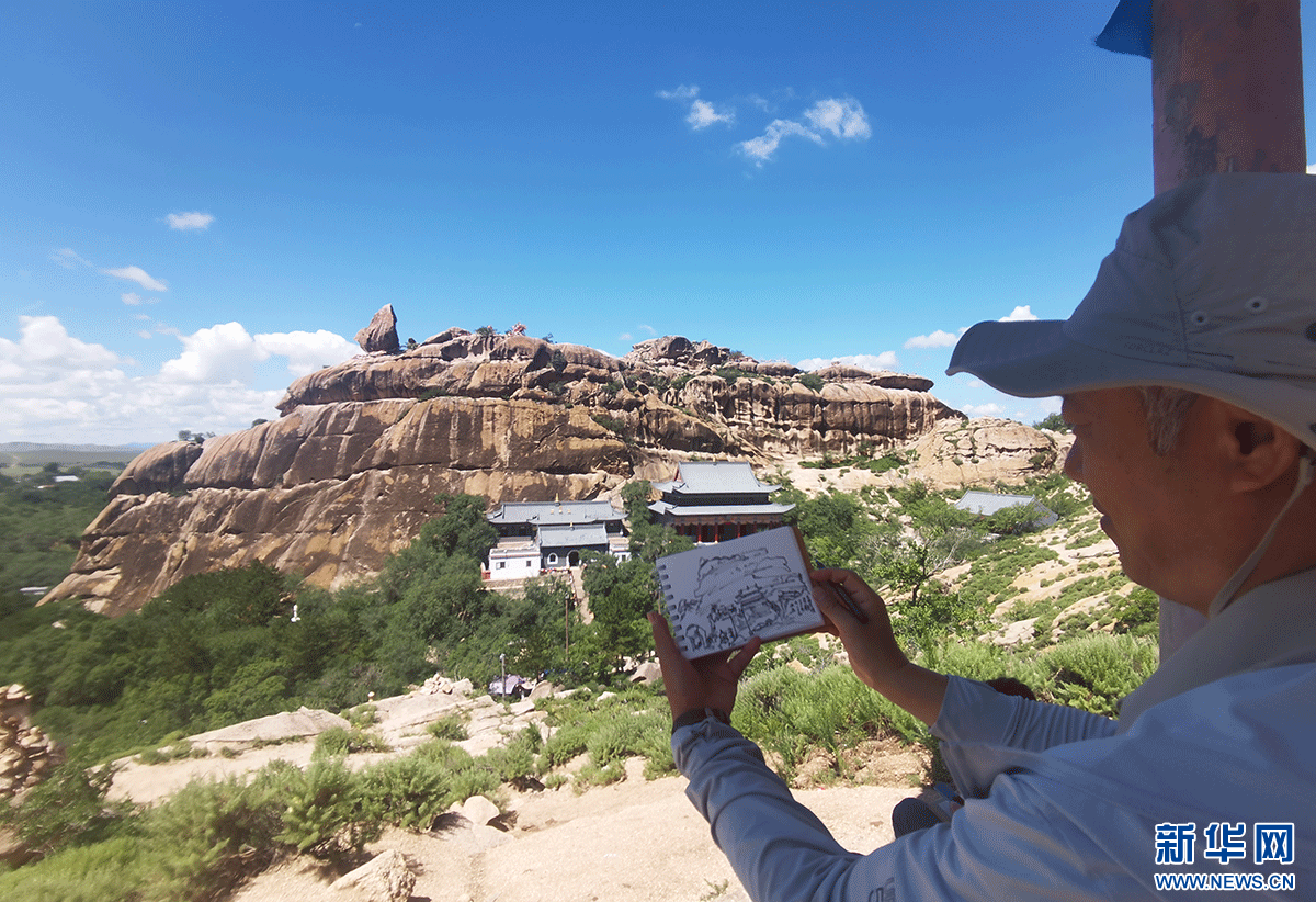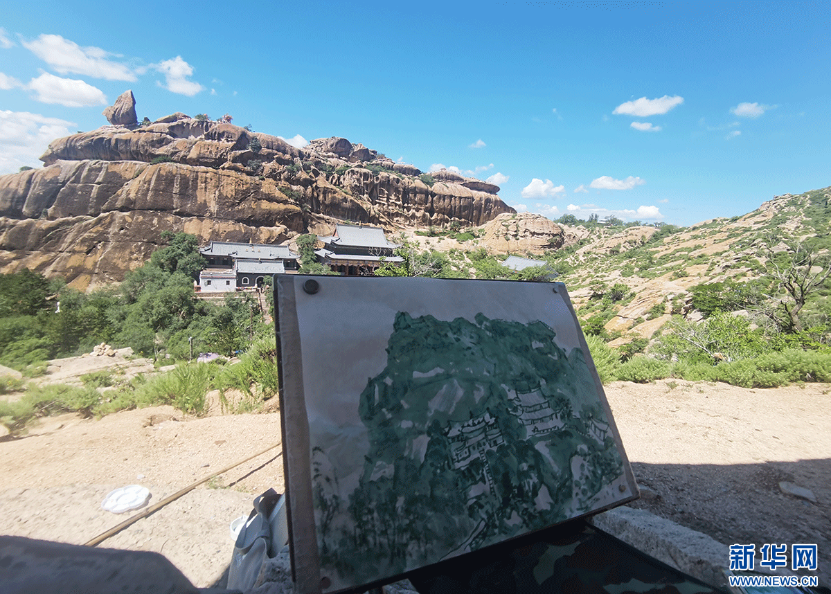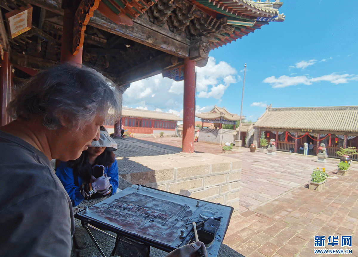 7月26日,畫家王躍奎在錫林郭勒盟多倫諾爾建筑群山西會(huì)館完成的寫生作品。新華網(wǎng)徐紅梅 攝