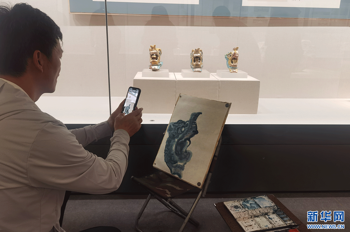7月24日,畫家王躍奎在錫林郭勒盟文化遺產(chǎn)博物館內(nèi)繪畫文物琉璃獅首。新華網(wǎng)徐紅梅 攝