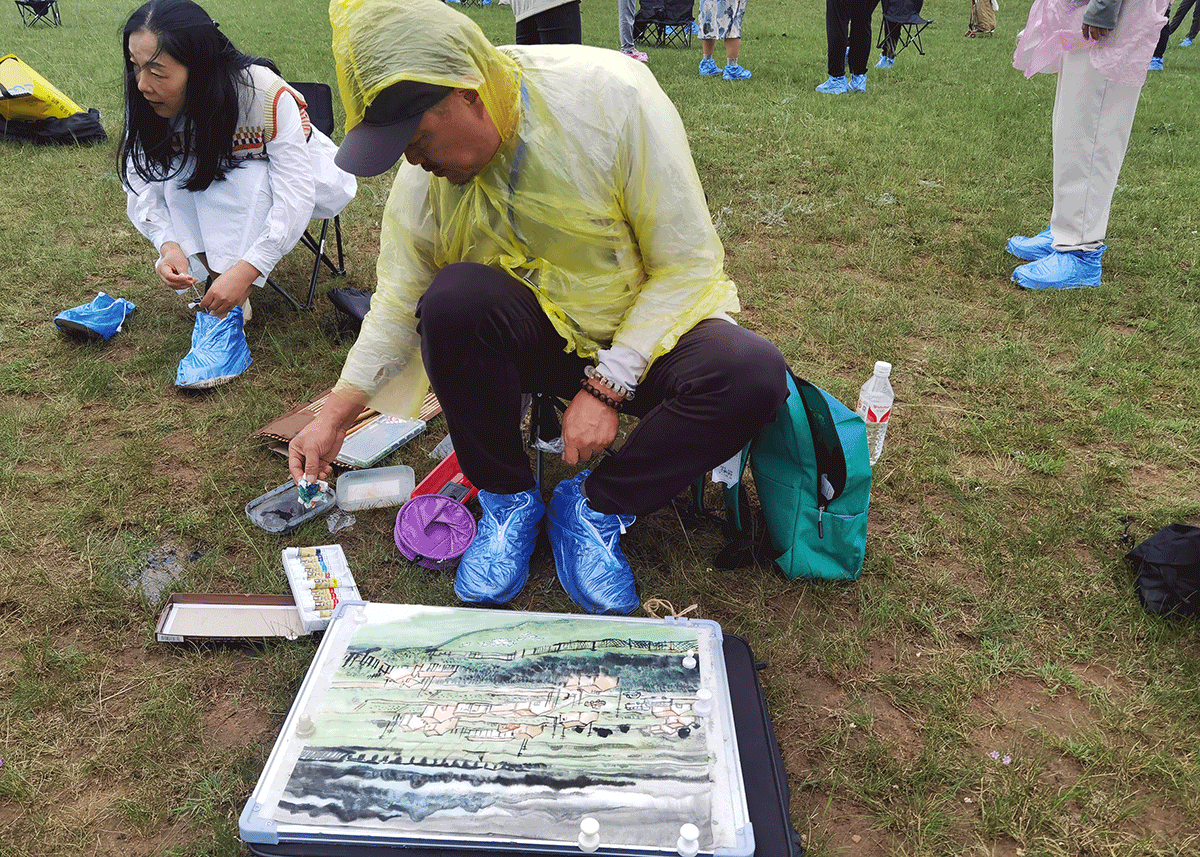 7月25日,畫家任清在錫林郭勒盟金界壕正藍(lán)旗段創(chuàng)作。新華網(wǎng)徐紅梅 攝