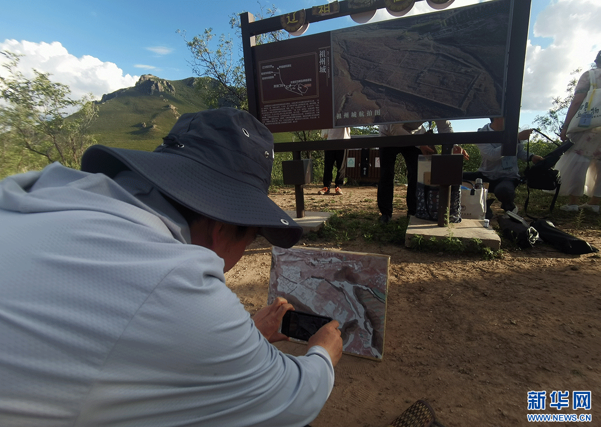 7月28日,畫家王躍奎為遼祖祖州城遺址航拍圖作品拍照。新華網(wǎng)徐紅梅 攝